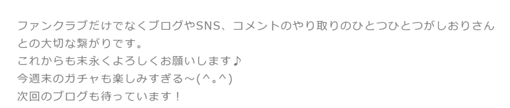 俺はファンクラブを見てないけど、しおりんの夢の実現のために、応援出来ればなっていつも思ってるよ!