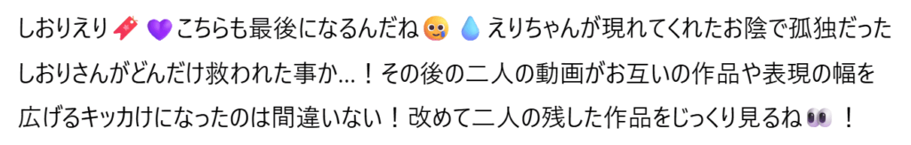 しおりさんとえりちゃんのコラボ動画をずっと楽しみに見てきたのでえりちゃんの引退は本当に寂しいね 一緒に撮影してきたしおりさんは計り知れないほど寂しいだろうね